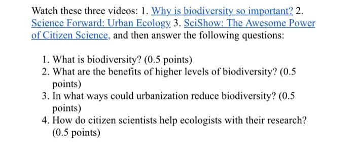 Solved Watch These Three Videos 1 Why Is Biodiversity So Chegg Com